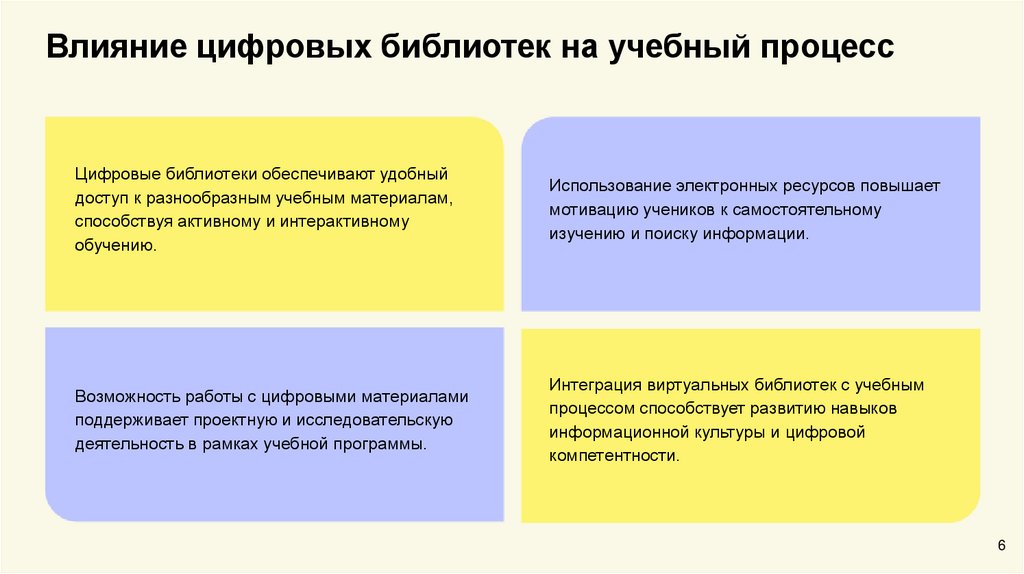 Влияние цифровых библиотек на учебный процессЦифровые библиотеки обеспечивают удобный