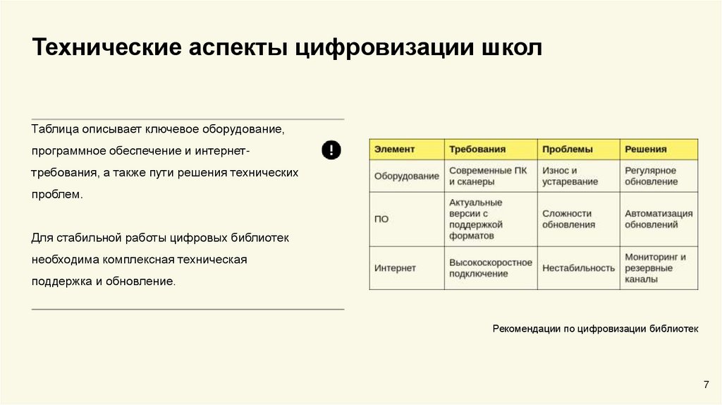 Технические аспекты цифровизации школТаблица описывает ключевое оборудование,