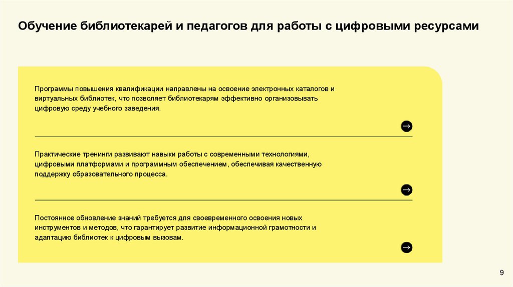 Обучение библиотекарей и педагогов для работы с цифровыми ресурсамиПрограммы повышения квалификации направлены на освоение электронных каталогов и