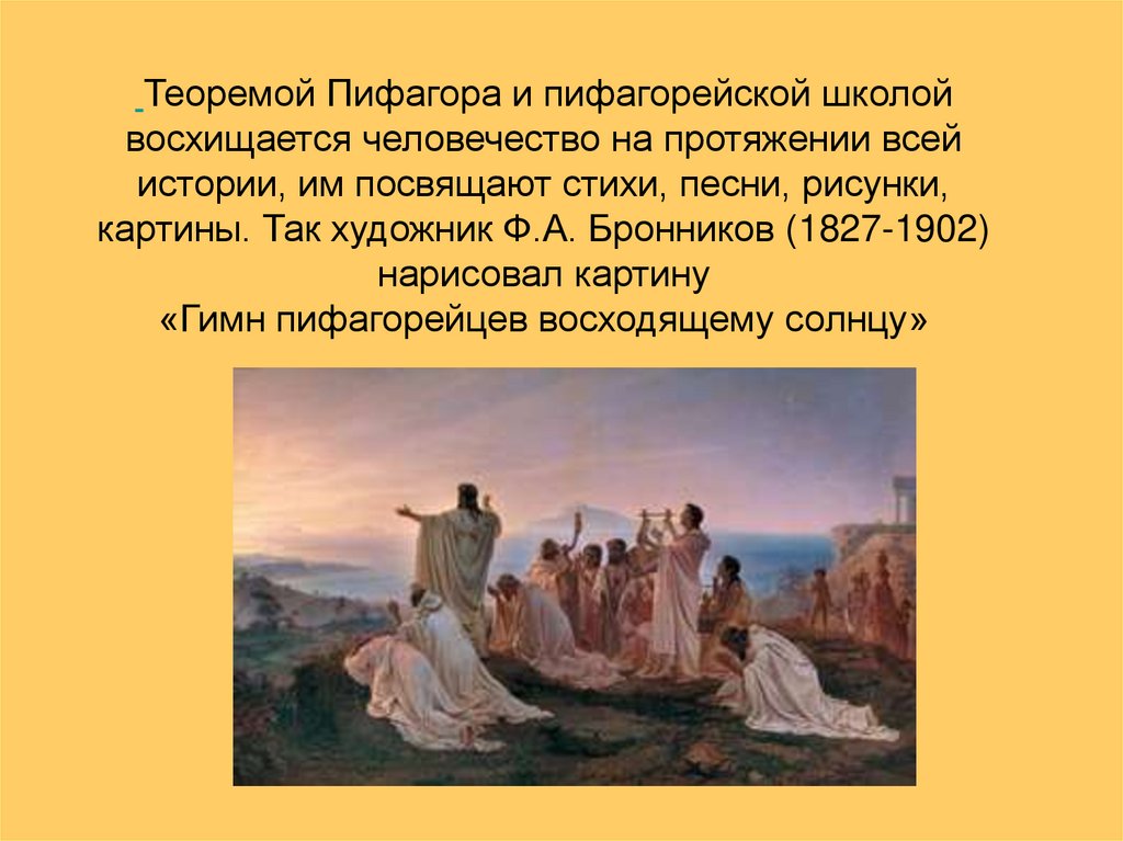 Теоремой Пифагора и пифагорейской школойвосхищается человечество на протяжении всей