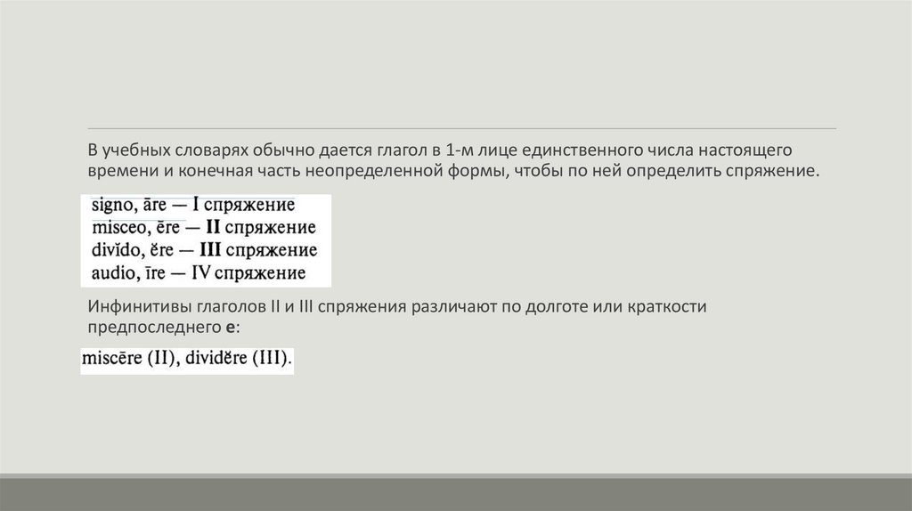 Латинские глаголы разделяются на четыре спряжения, которые отличаются друг от другасвоими основами. Принадлежность глагола к тому или другому спряжению определяется