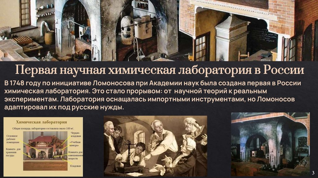 Первая научная химическая лаборатория в РоссииВ 1748 году по инициативе Ломоносова при Академии наук была создана первая в России