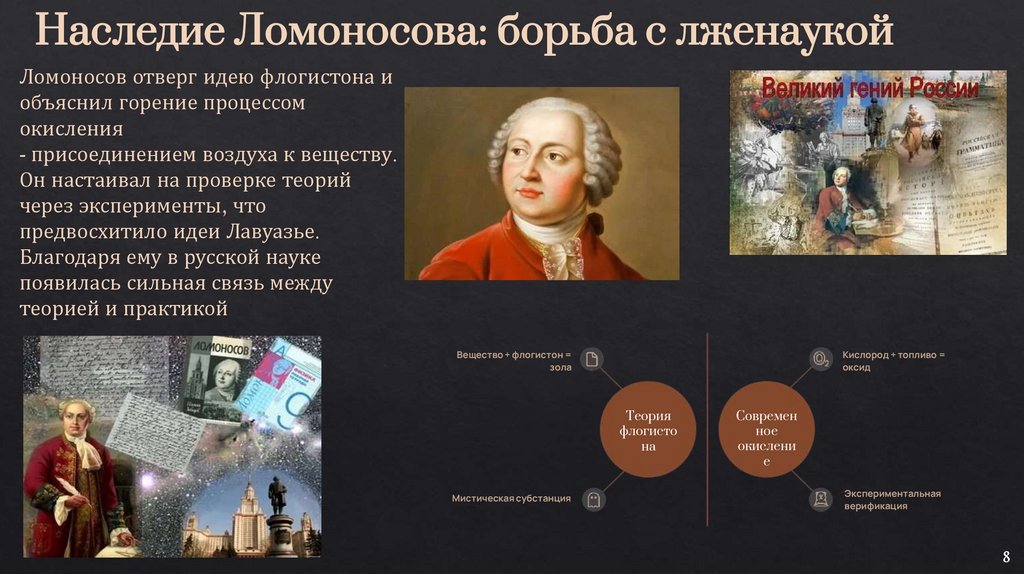 Наследие Ломоносова: борьба с лженаукойЛомоносов отверг идею флогистона и