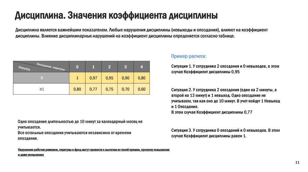 Дисциплина. Значения коэффициента дисциплиныДисциплина является важнейшим показателем. Любые нарушения дисциплины (невыходы и опоздания), влияют на коэффициент