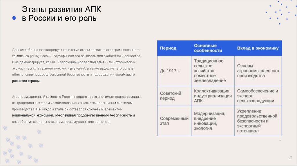 Данная таблица иллюстрирует ключевые этапы развития агропромышленного