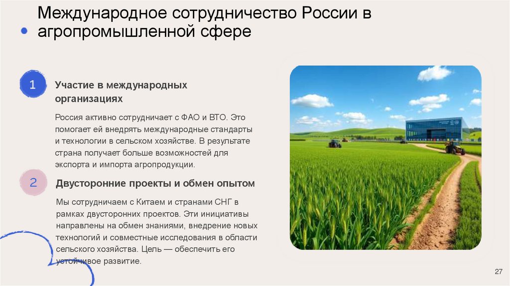 Россия активно сотрудничает с ФАО и ВТО. Это