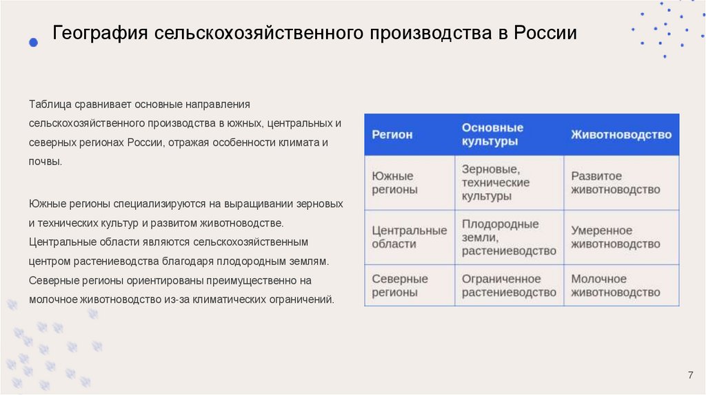 География сельскохозяйственного производства в РоссииТаблица сравнивает основные направления