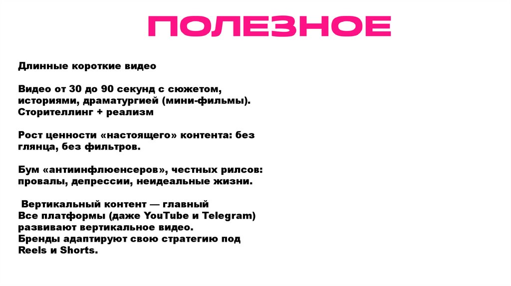 Длинные короткие видеоВидео от 30 до 90 секунд с сюжетом,
