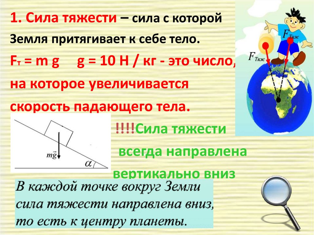 1. Сила тяжести – сила с которойЗемля притягивает к себе тело.