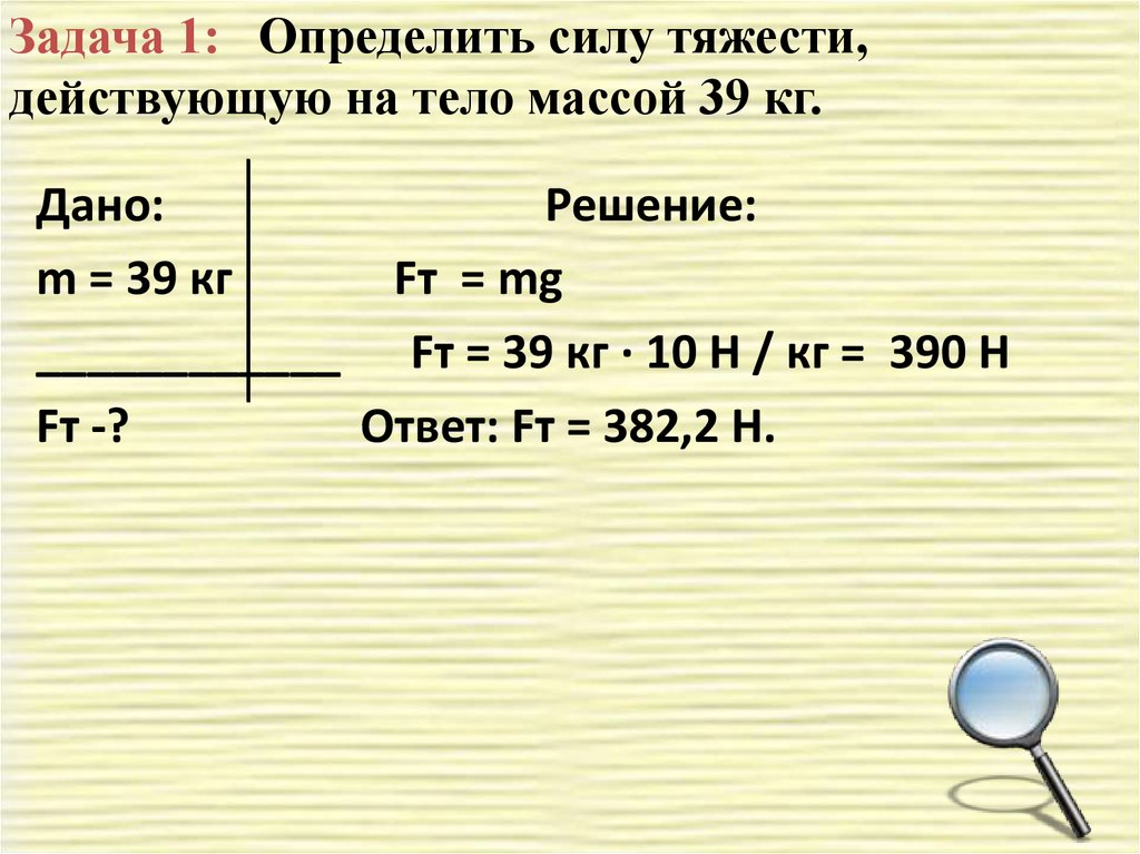 Задача 1: Определить силу тяжести,действующую на тело массой 39 кг.