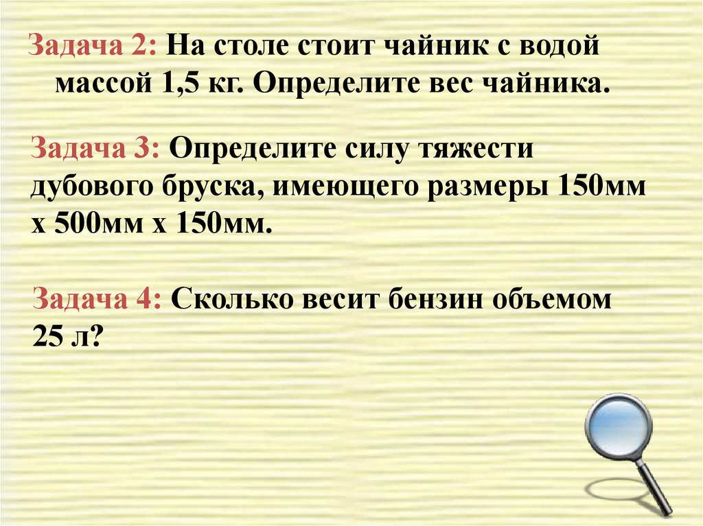 Задача 2: На столе стоит чайник с водоймассой 1,5 кг. Определите вес чайника.