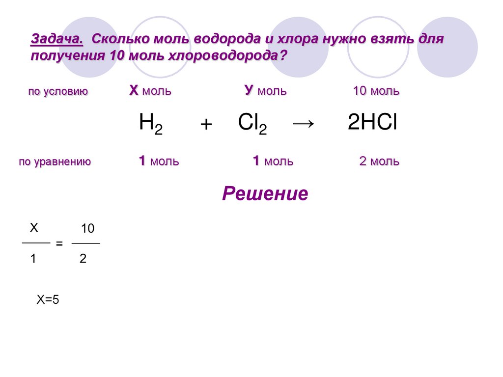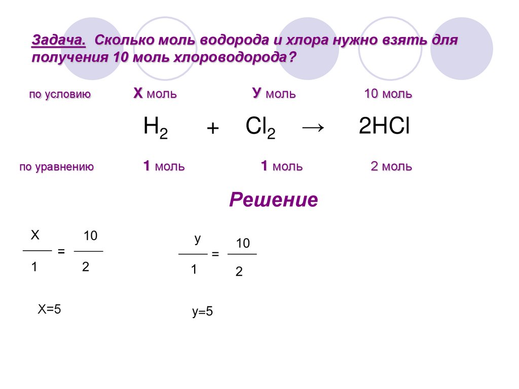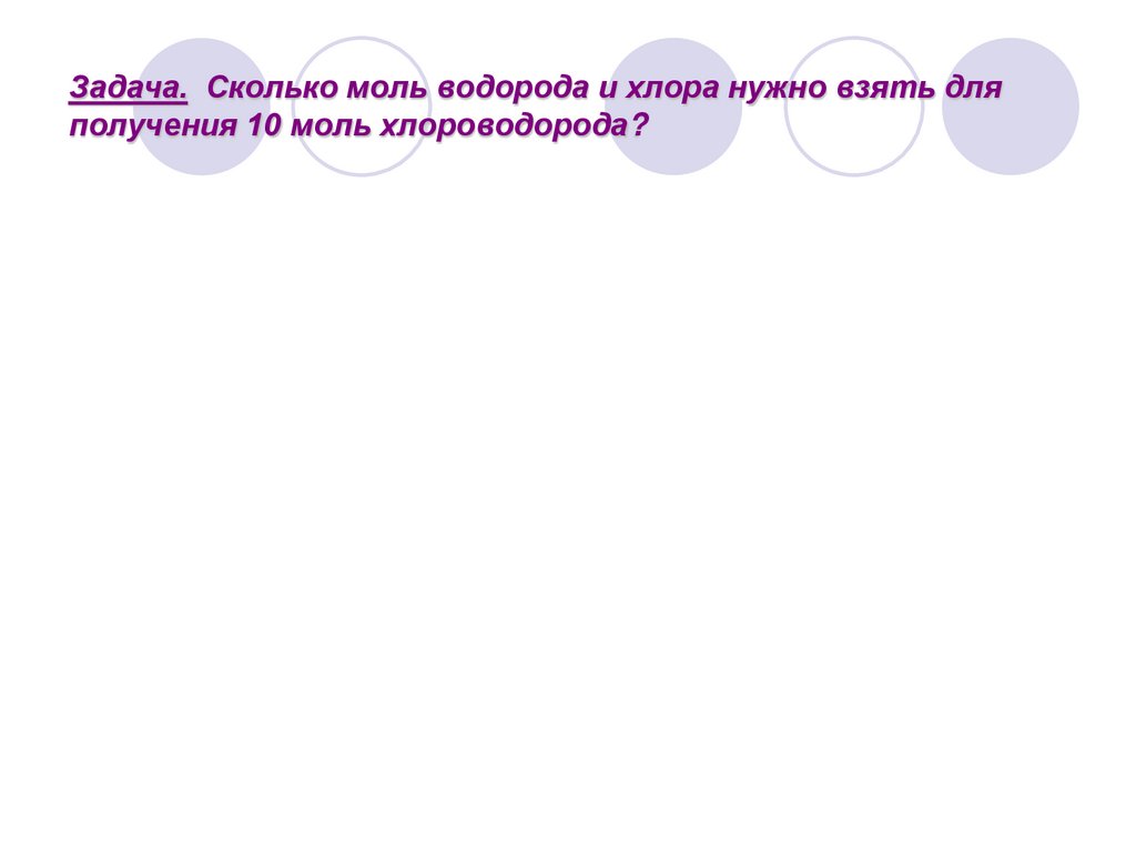 Задача. Сколько моль водорода и хлора нужно взять дляполучения 10 моль хлороводорода?
