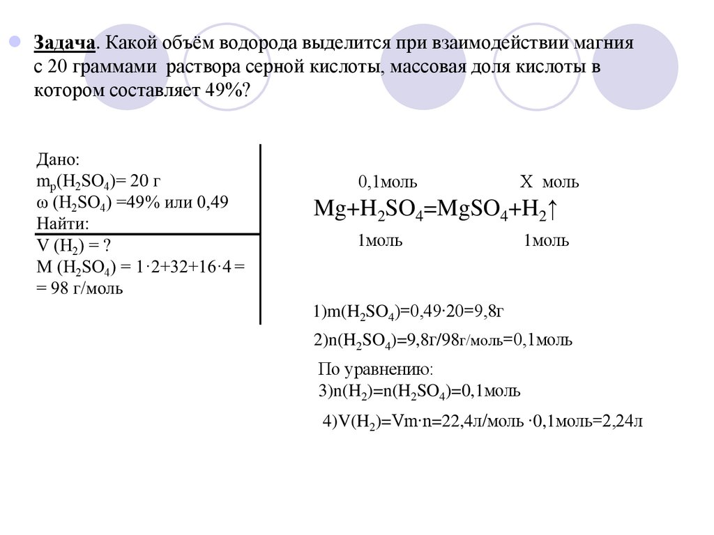 Задача. Какой объём водорода выделится при взаимодействии магнияс 20 граммами раствора серной кислоты, массовая доля кислоты в