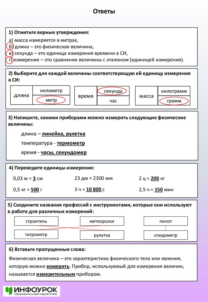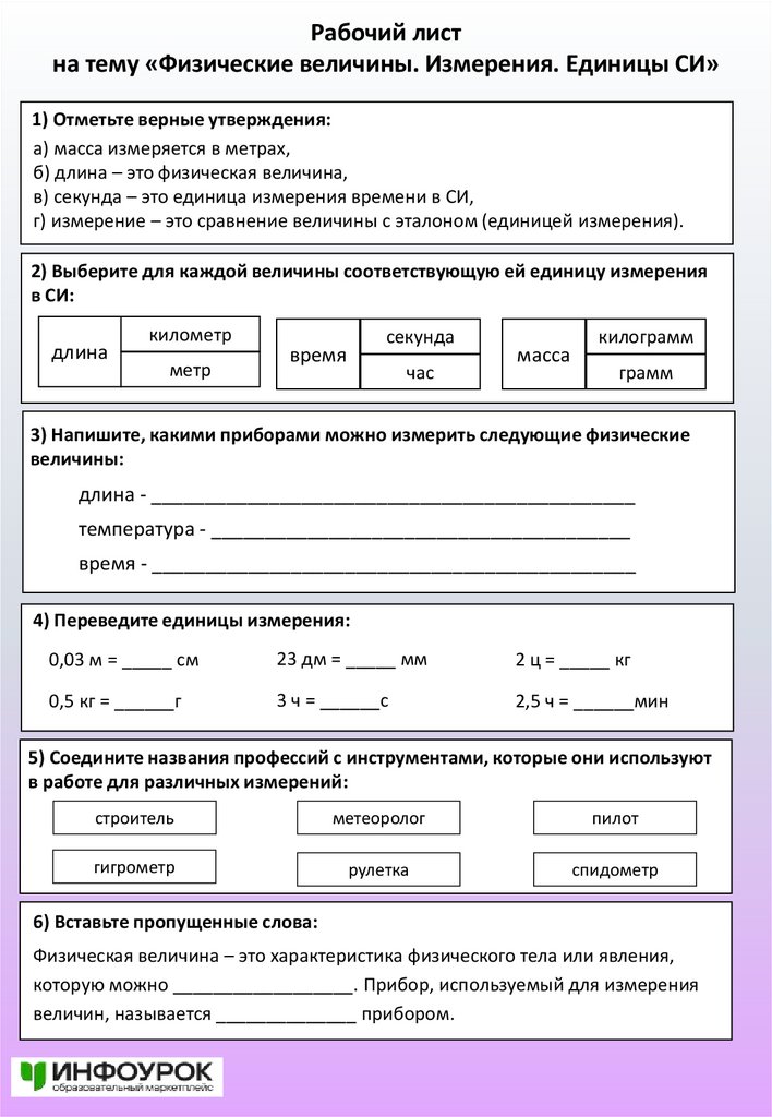 Рабочий листна тему «Физические величины. Измерения. Единицы СИ»