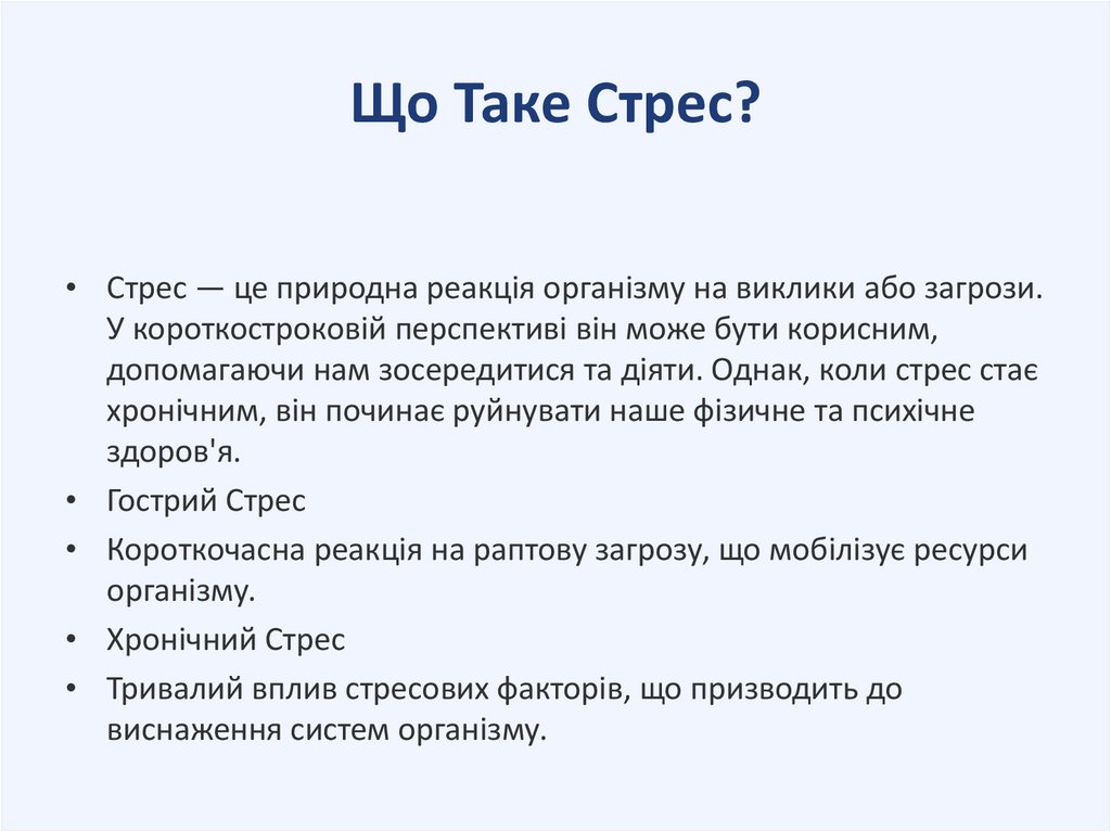 Що Таке Стрес?• Стрес — це природна реакція організму на виклики або загрози.
