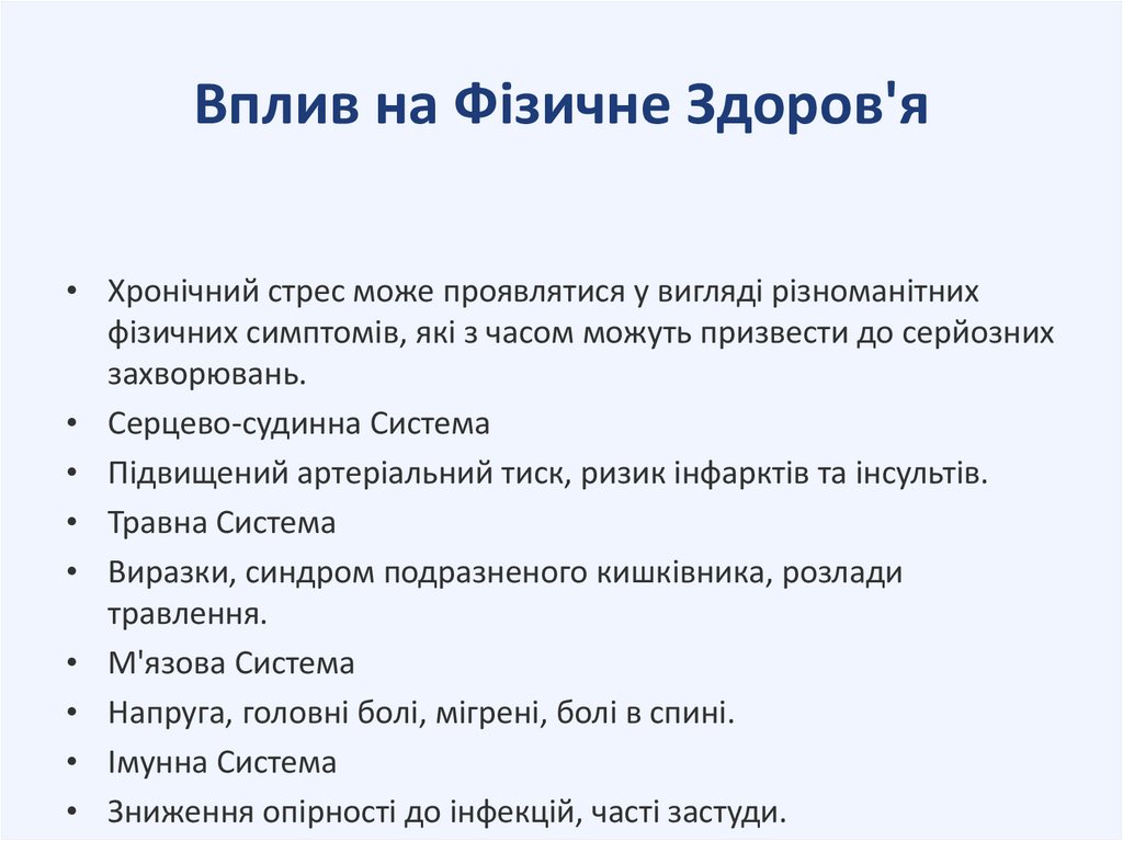 Вплив на Фізичне Здоров'я• Хронічний стрес може проявлятися у вигляді різноманітних