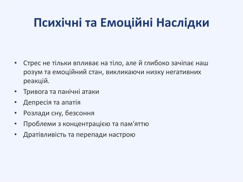 Психічні та Емоційні Наслідки• Стрес не тільки впливає на тіло, але й глибоко зачіпає наш