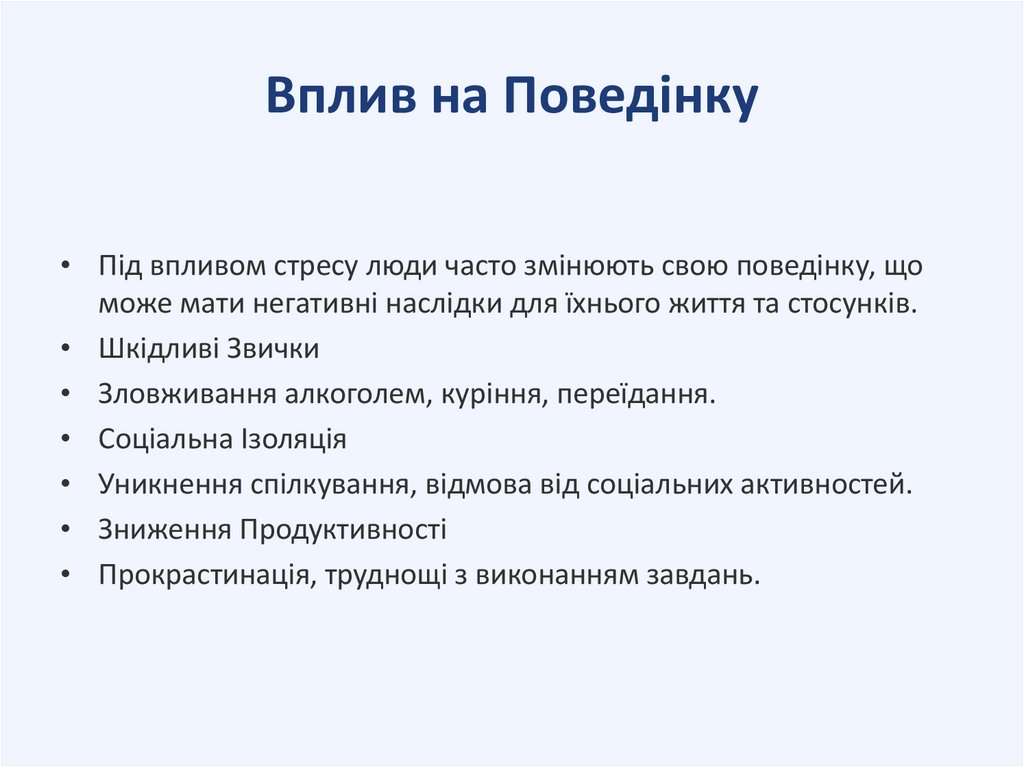 Вплив на Поведінку• Під впливом стресу люди часто змінюють свою поведінку, що
