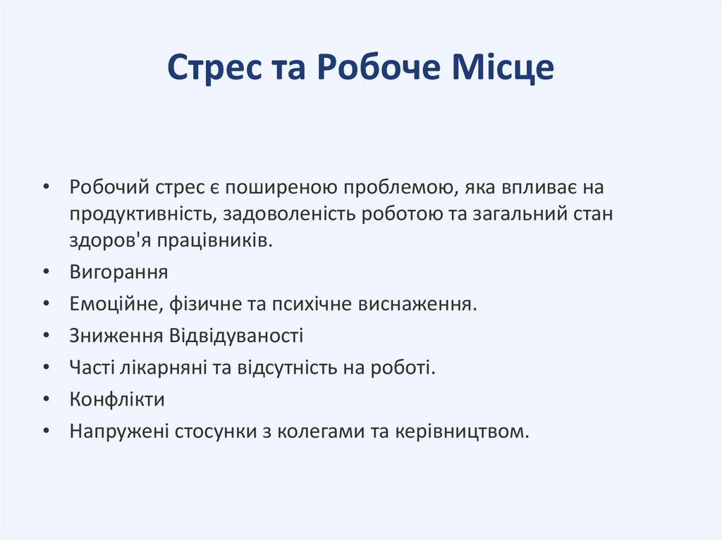 Стрес та Робоче Місце• Робочий стрес є поширеною проблемою, яка впливає на
