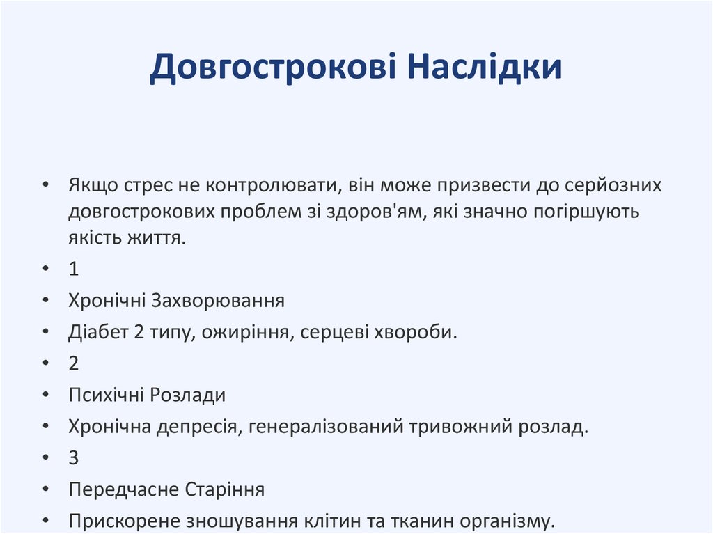 Довгострокові Наслідки• Якщо стрес не контролювати, він може призвести до серйозних