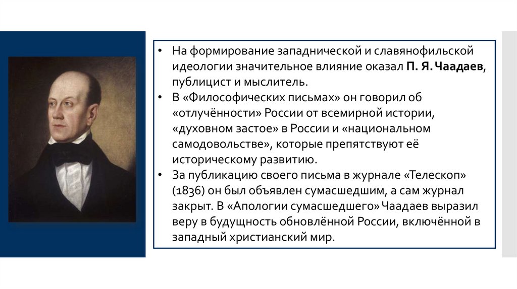 • На формирование западнической и славянофильскойидеологии значительное влияние оказал П. Я. Чаадаев,