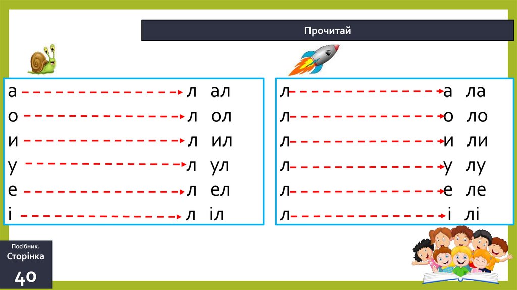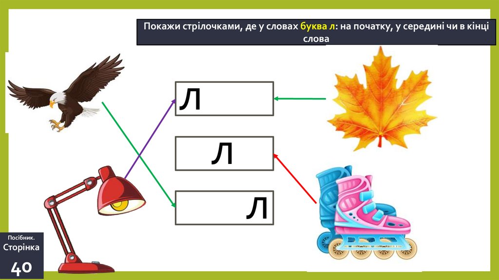 Покажи стрілочками, де у словах буква л: на початку, у середині чи в кінці