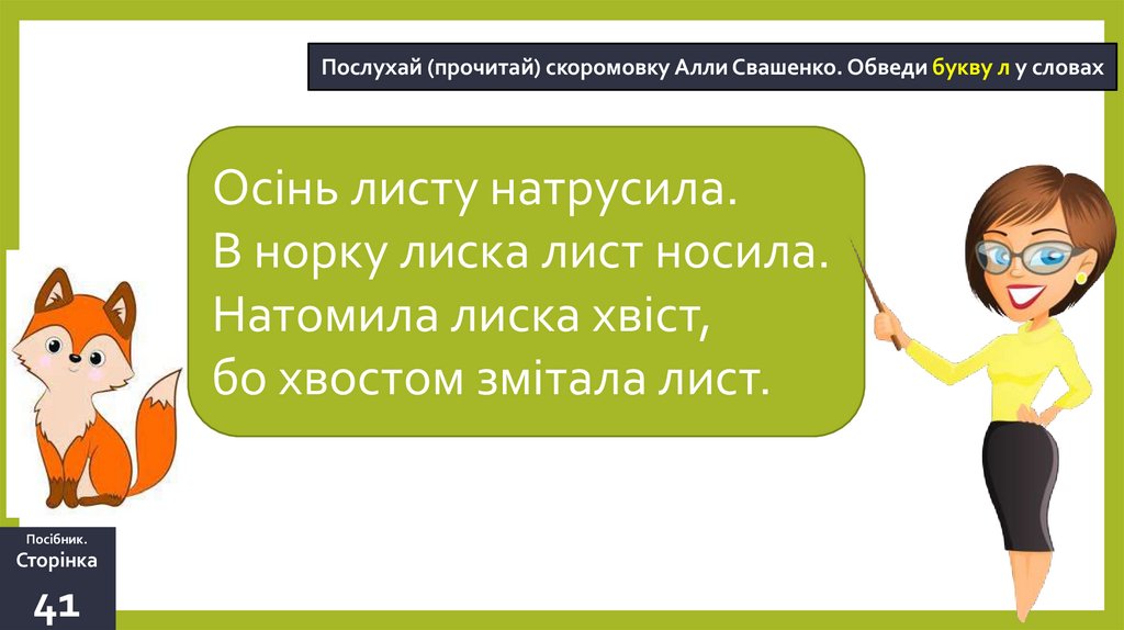 Послухай (прочитай) скоромовку Алли Свашенко. Обведи букву л у словах