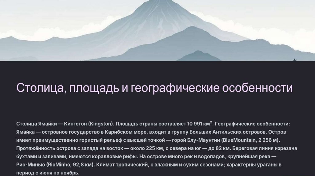 Столица, площадь и географические особенностиСтолица Ямайки — Кингстон (Kingston). Площадь страны составляет 10 991 км². Географические особенности: