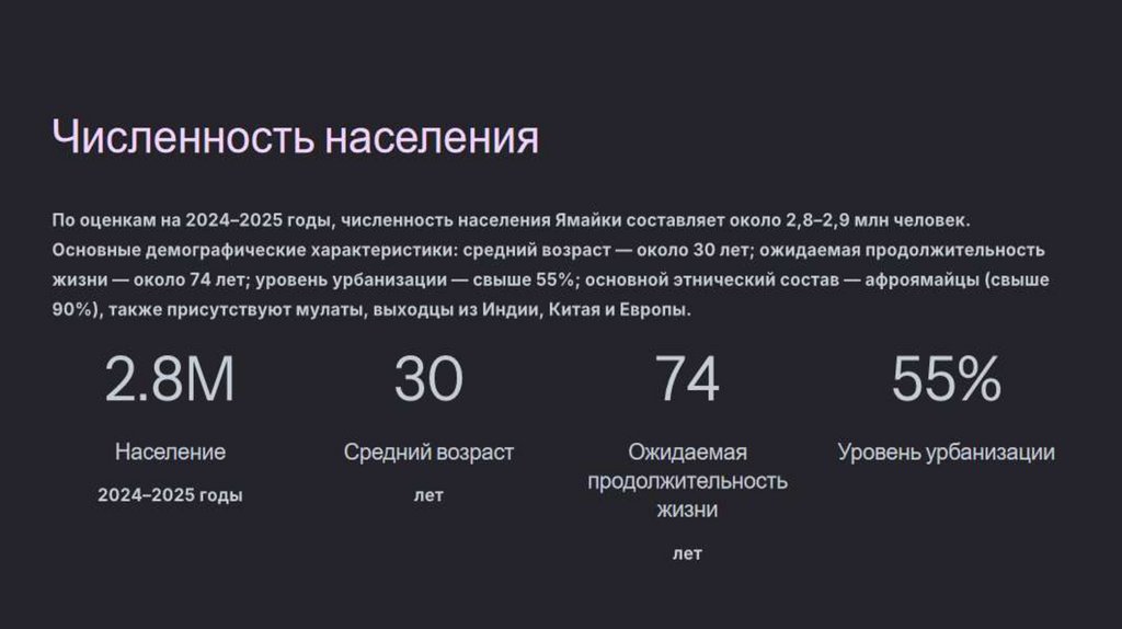 жизни — около 74 лет; уровень урбанизации — свыше 55%; основной этнический состав — афроямайцы (свыше