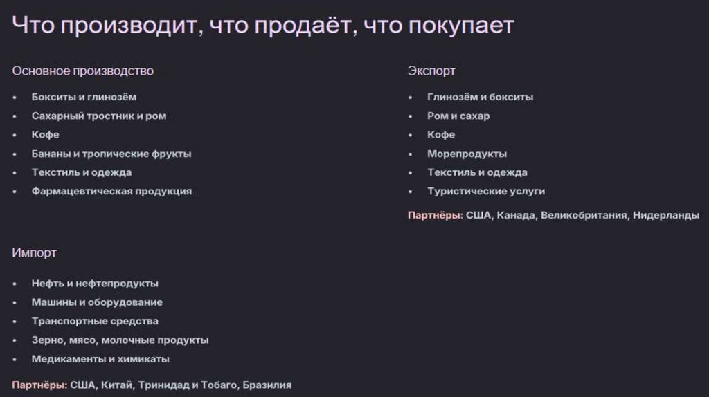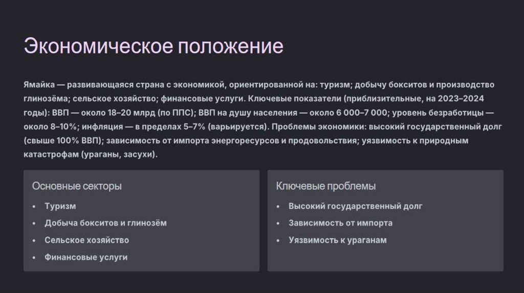 Экономическое положениеЯмайка — развивающаяся страна с экономикой, ориентированной на: туризм; добычу бокситов и производство