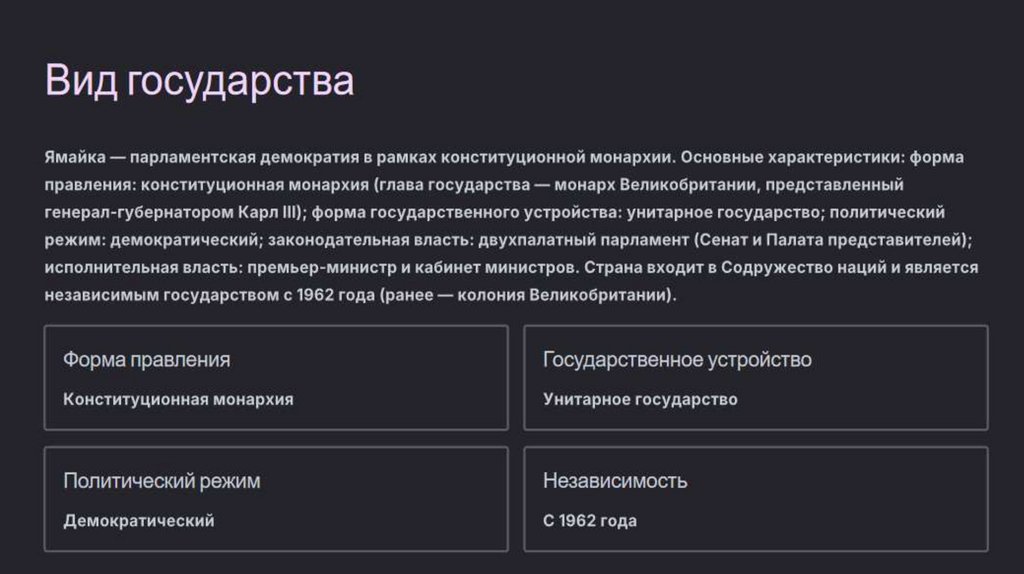 Вид государстваЯмайка — парламентская демократия в рамках конституционной монархии. Основные характеристики: форма