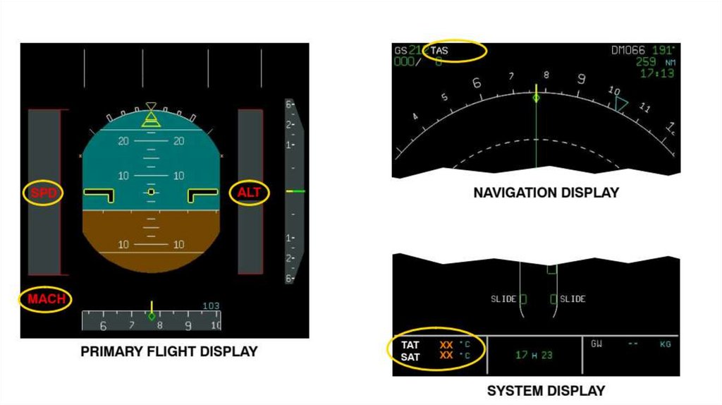 (первичные полетные дисплеи) и ND (навигационные дисплеи), а также на индикатор угла атаки и в