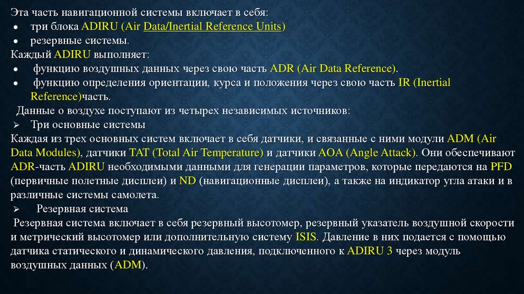 Эта часть навигационной системы включает в себя:● три блока ADIRU (Air Data/Inertial Reference Units)