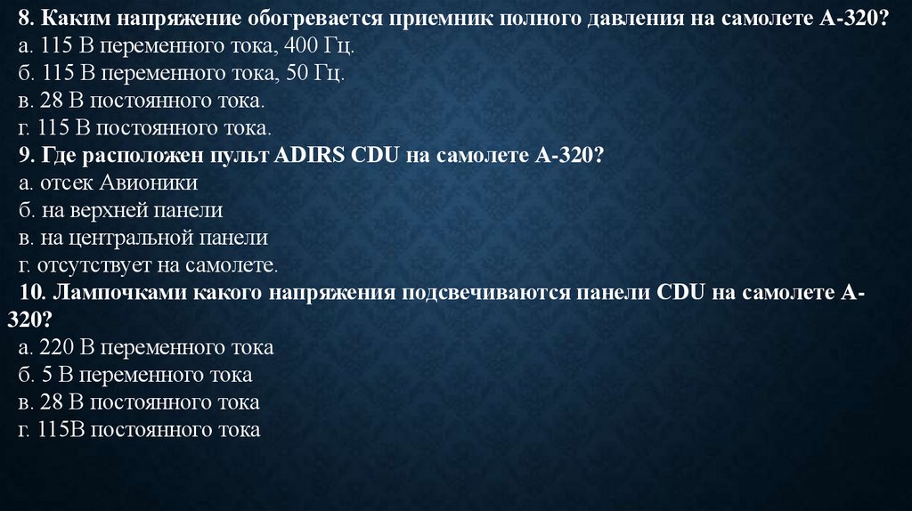 8. Каким напряжение обогревается приемник полного давления на самолете А-320?а. 115 В переменного тока, 400 Гц.