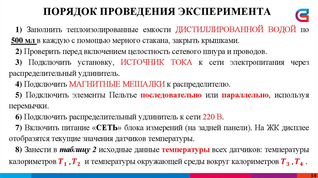 • Научиться измерять тепло Пельтье калориметрическим способом