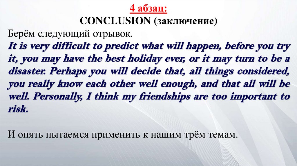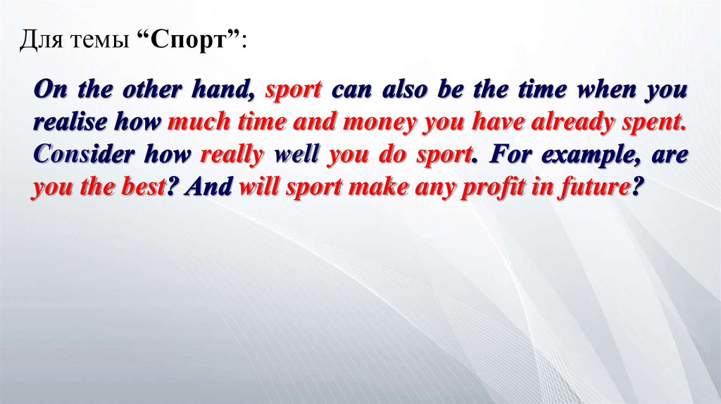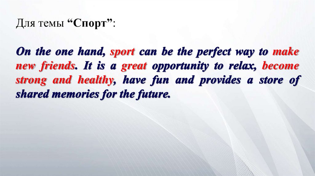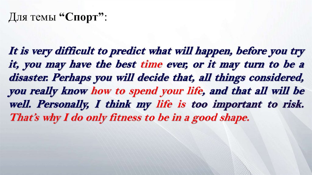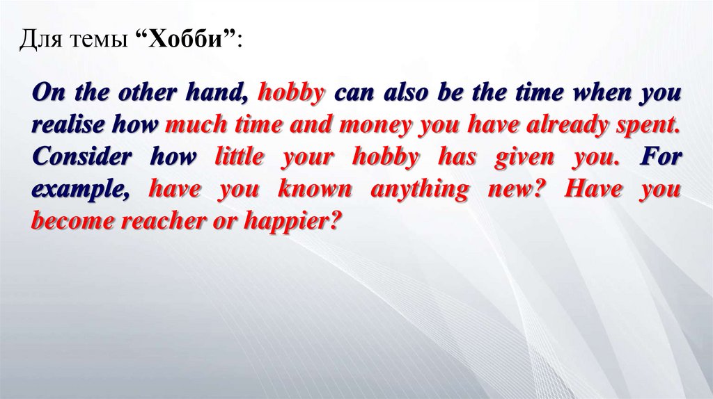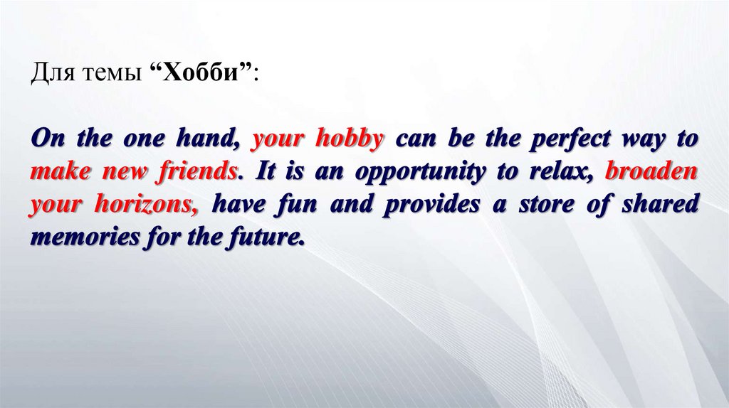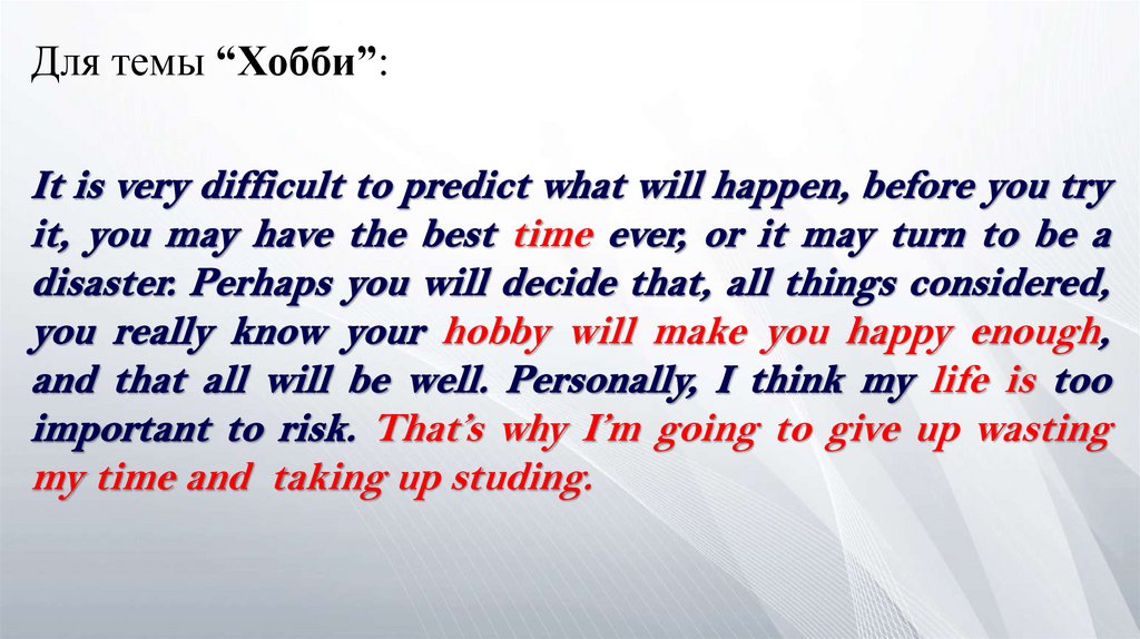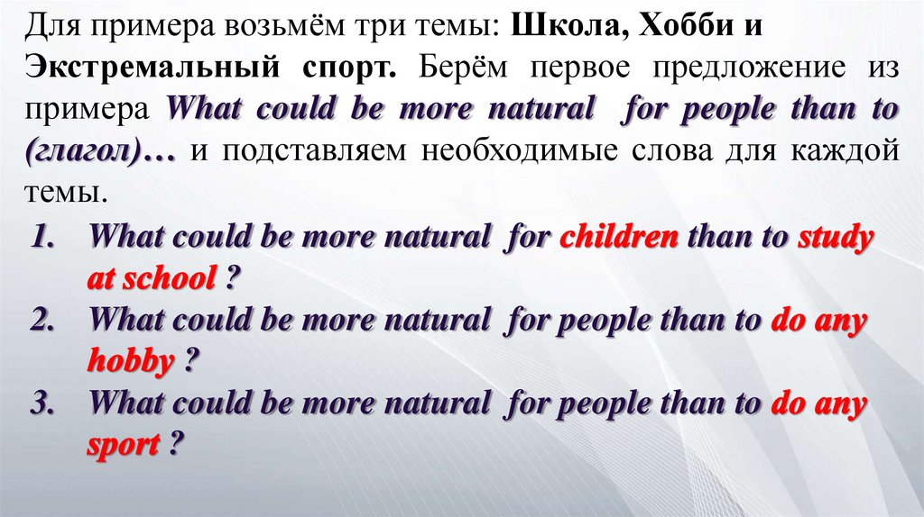 Для примера возьмём три темы: Школа, Хобби иЭкстремальный спорт. Берём первое предложение из