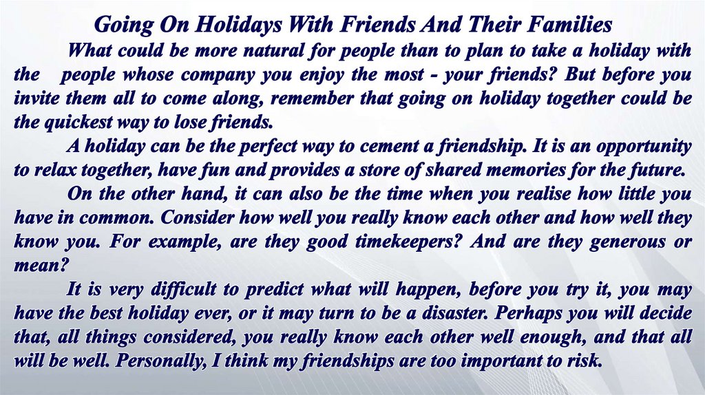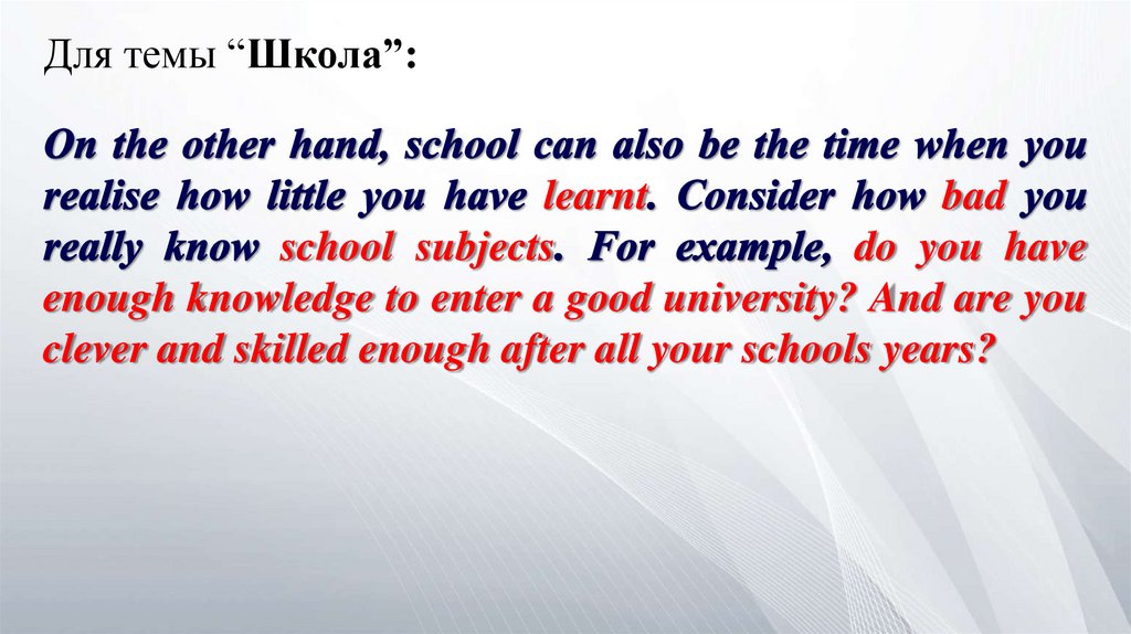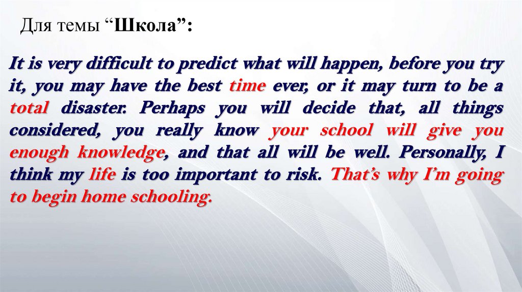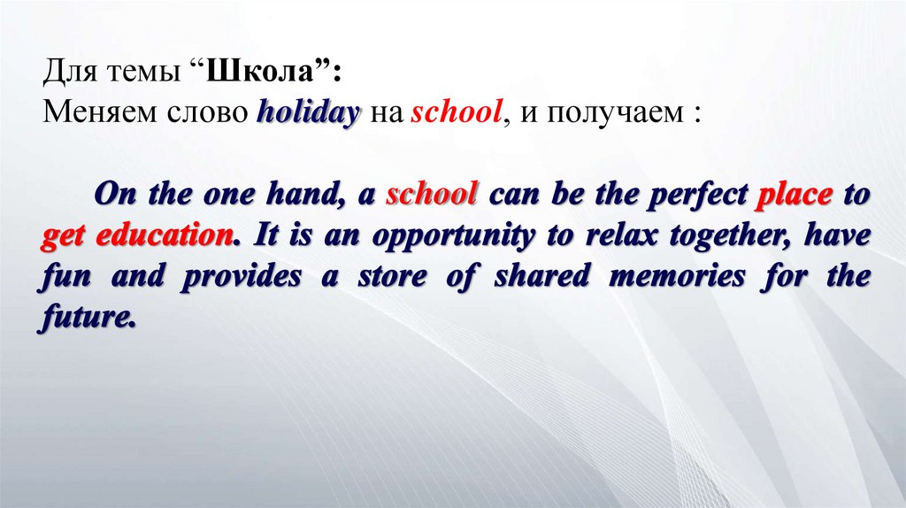 Для темы “Школа”:Меняем слово holiday на school, и получаем :
