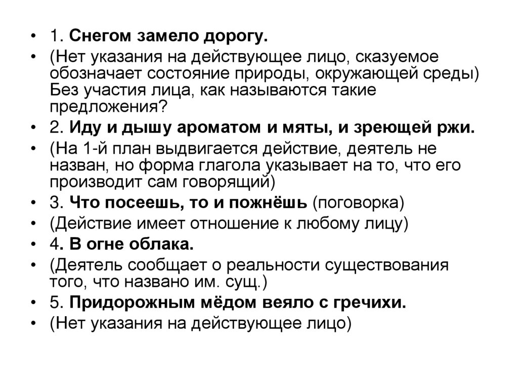 • 1. Снегом замело дорогу.• (Нет указания на действующее лицо, сказуемое