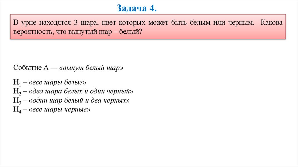 Задача 4.В урне находятся 3 шара, цвет которых может быть белым или черным. Какова