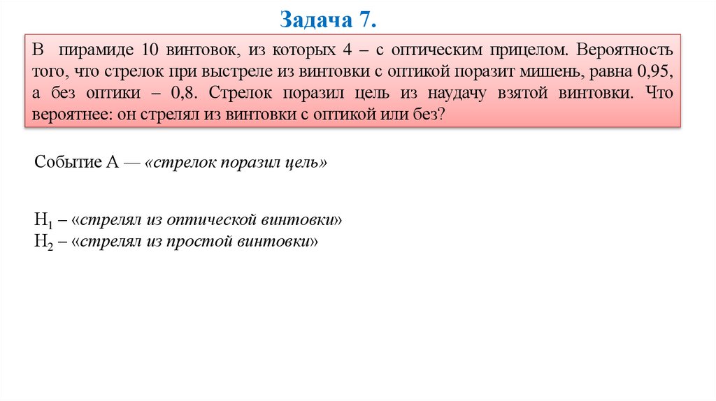 Задача 7.В пирамиде 10 винтовок, из которых 4 – с оптическим прицелом. Вероятность