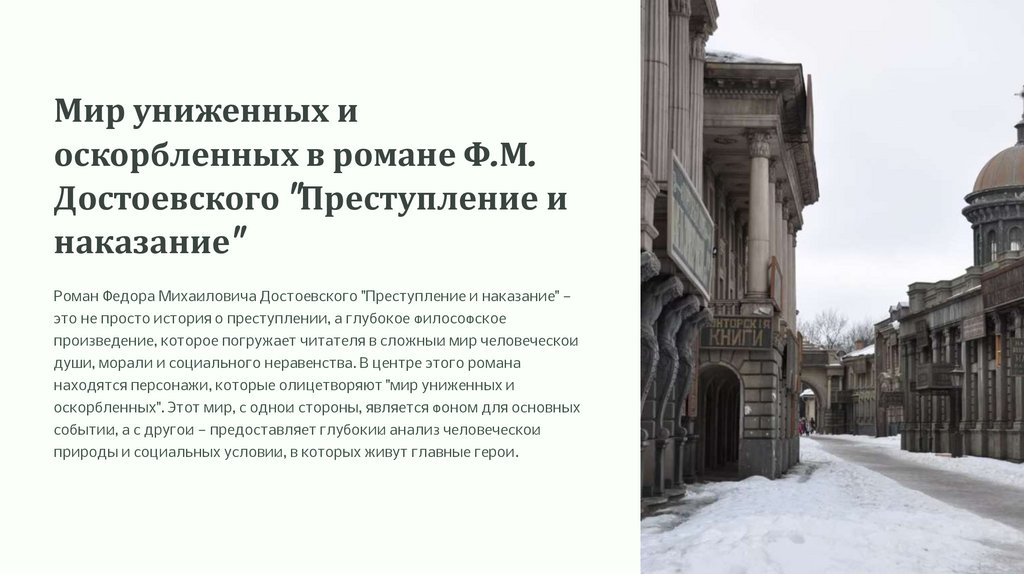 "Мир униженных и оскорбленных" в "Преступлении и наказании" является неотъемлемой частью романа, раскрывая не только