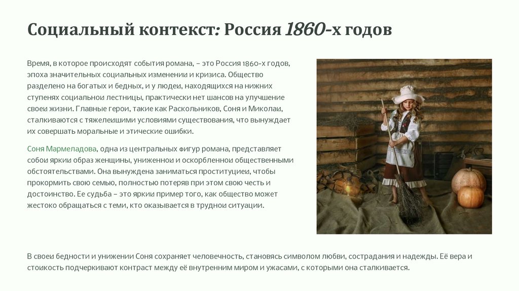 Социальный контекст: Россия 1860-х годовВремя, в которое происходят события романа, — это Россия 1860-х годов,