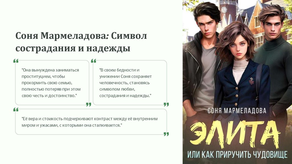 В своей бедности и унижении Соня сохраняет человечность, становясь символом любви, сострадания и надежды. Её вера и