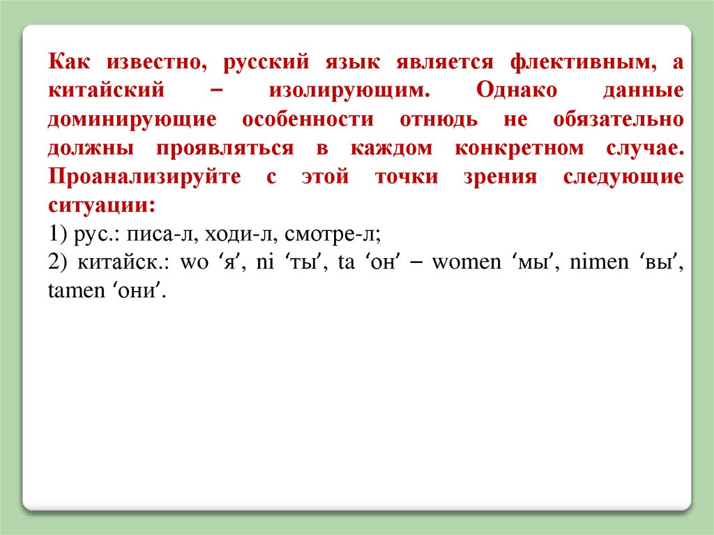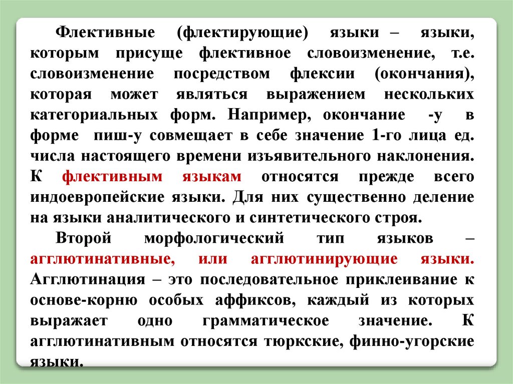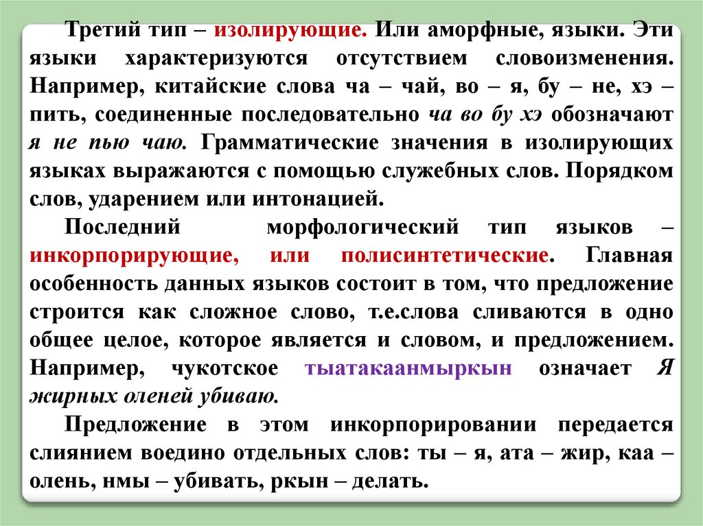 Третий тип – изолирующие. Или аморфные, языки. Этиязыки характеризуются отсутствием словоизменения.