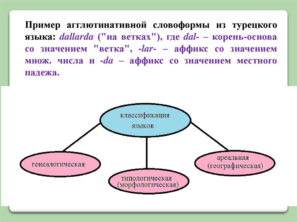Пример агглютинативной словоформы из турецкогоязыка: dallarda ("на ветках"), где dal- – корень-основа
