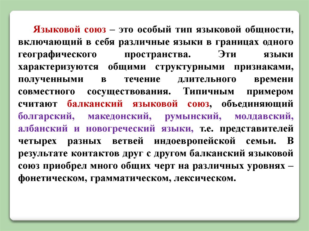 Языковой союз – это особый тип языковой общности,включающий в себя различные языки в границах одного