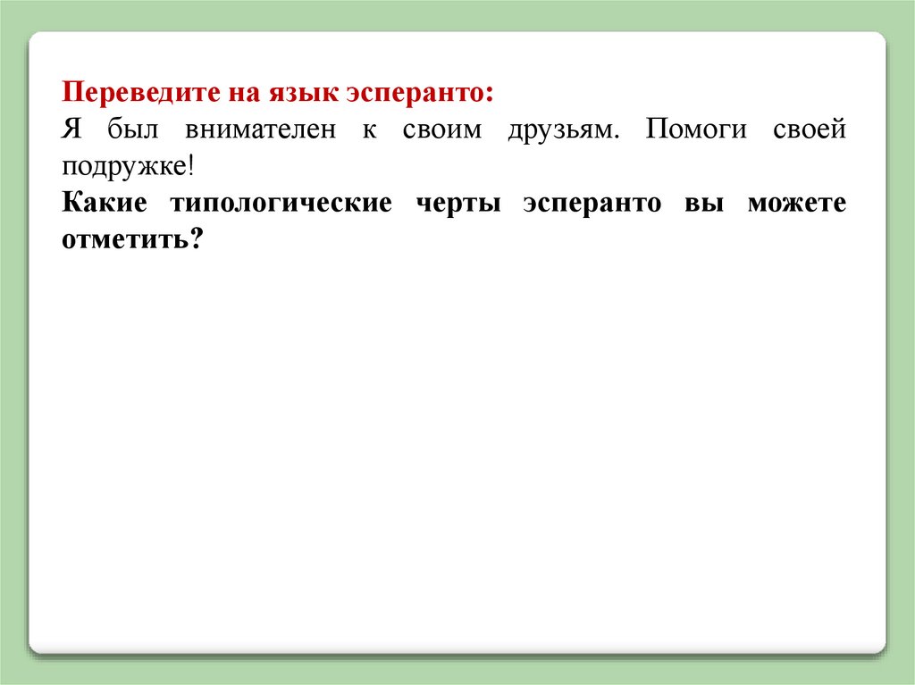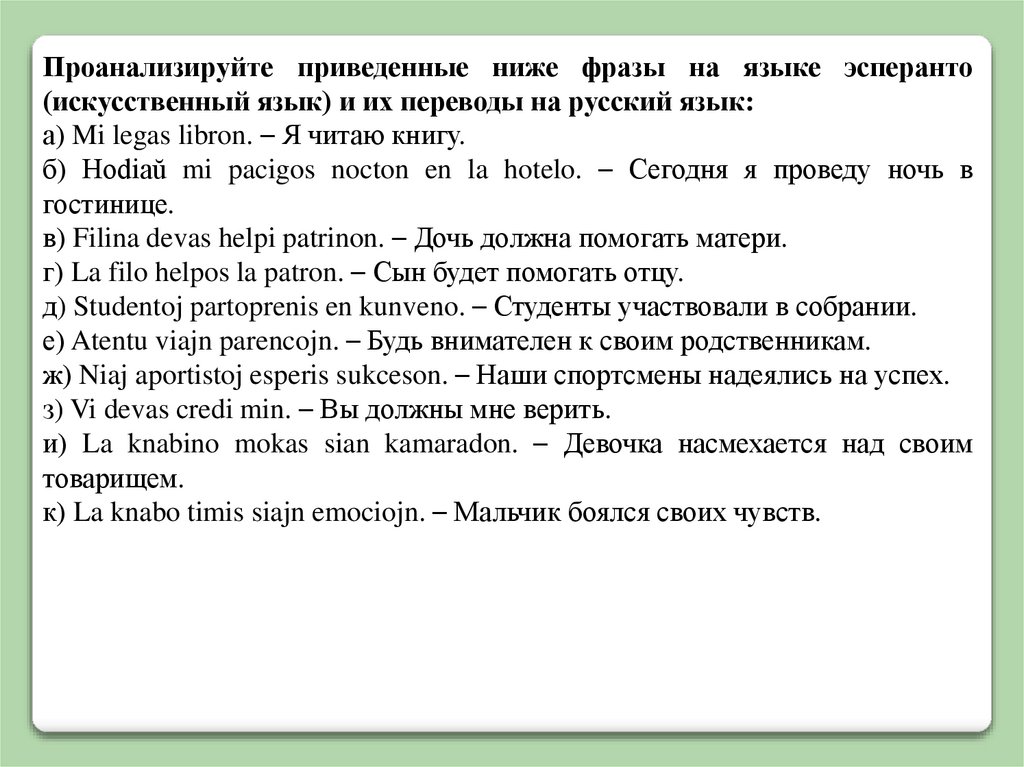 Проанализируйте приведенные ниже фразы на языке эсперанто(искусственный язык) и их переводы на русский язык: