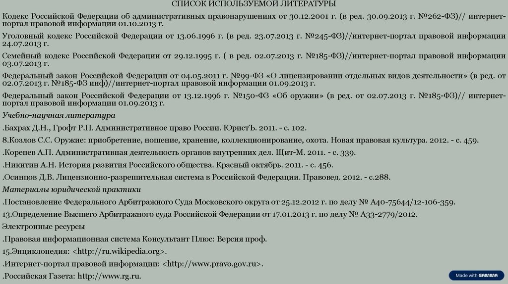 Федеральный закон Российской Федерации от 13.12.1996 г. №150-ФЗ «Об оружии» (в ред. от 02.07.2013 г. №185-ФЗ)// интернетпортал правовой информации 01.09.2013 г.
