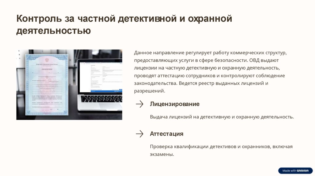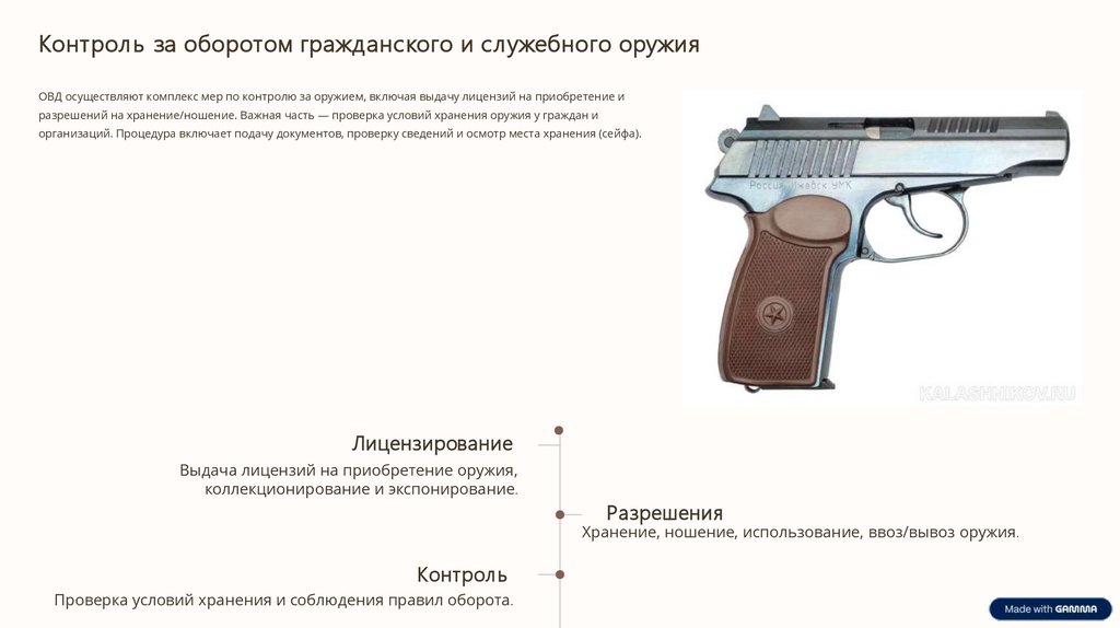 Контрол ь за оборотом гражданского и служебного оружияОВД осуществляют комплекс мер по контролю за оружием, включая выдачу лицензий на приобретение и