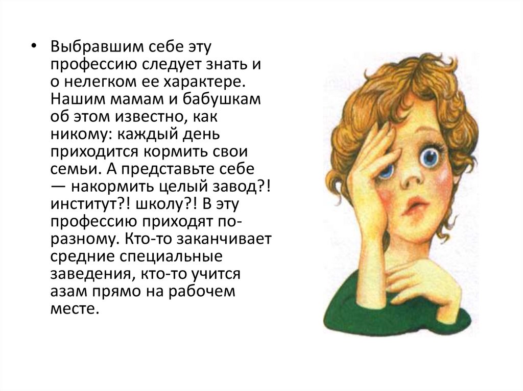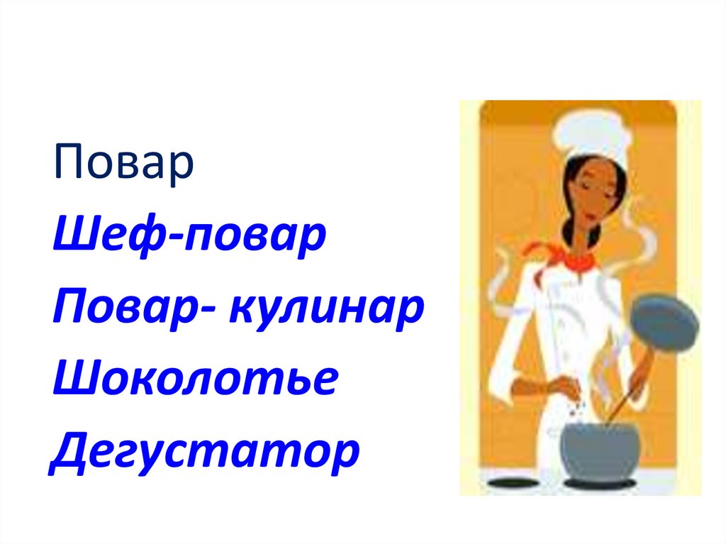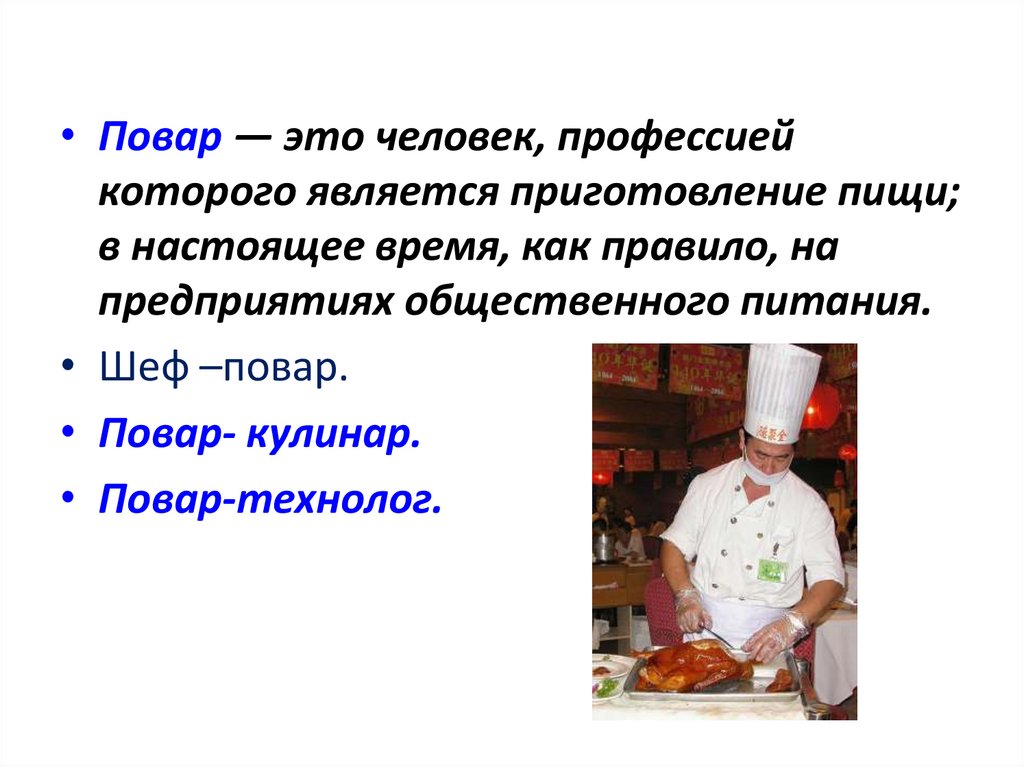 • Повар — это человек, профессиейкоторого является приготовление пищи;